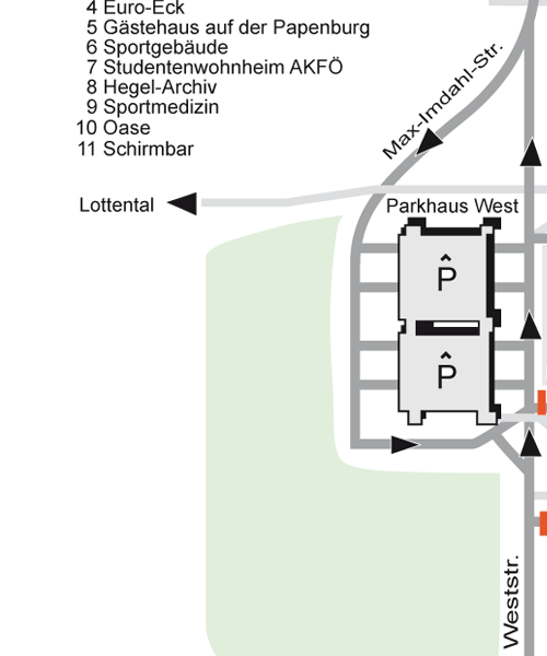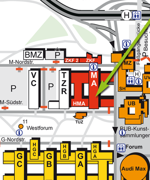 Mit dem Auto erreichen Sie die Universität über die A43, Abfahrt Bochum-Querenburg, Ruhr-Universität (Abfahrt Nr. 19). Zum Parken benutzen Sie bitte die in der Abbildung mit Parkhaus-West markierten Parkhäuser. Sie haben dann nur einen Fußweg von ca. 3 Minuten.