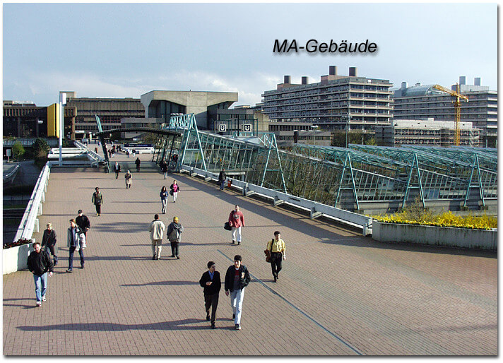 Sie erreichen die Universität mit der U-Bahn der Linie U35. Das MA-Gebäude (rote Streifen an den Lüftungsschächten auf dem Dach) finden Sie auf der rechten Seite, wenn Sie aus der U-Bahn Station kommen und über die Fußgänger-Brücke zur Universität gehen (siehe Foto).